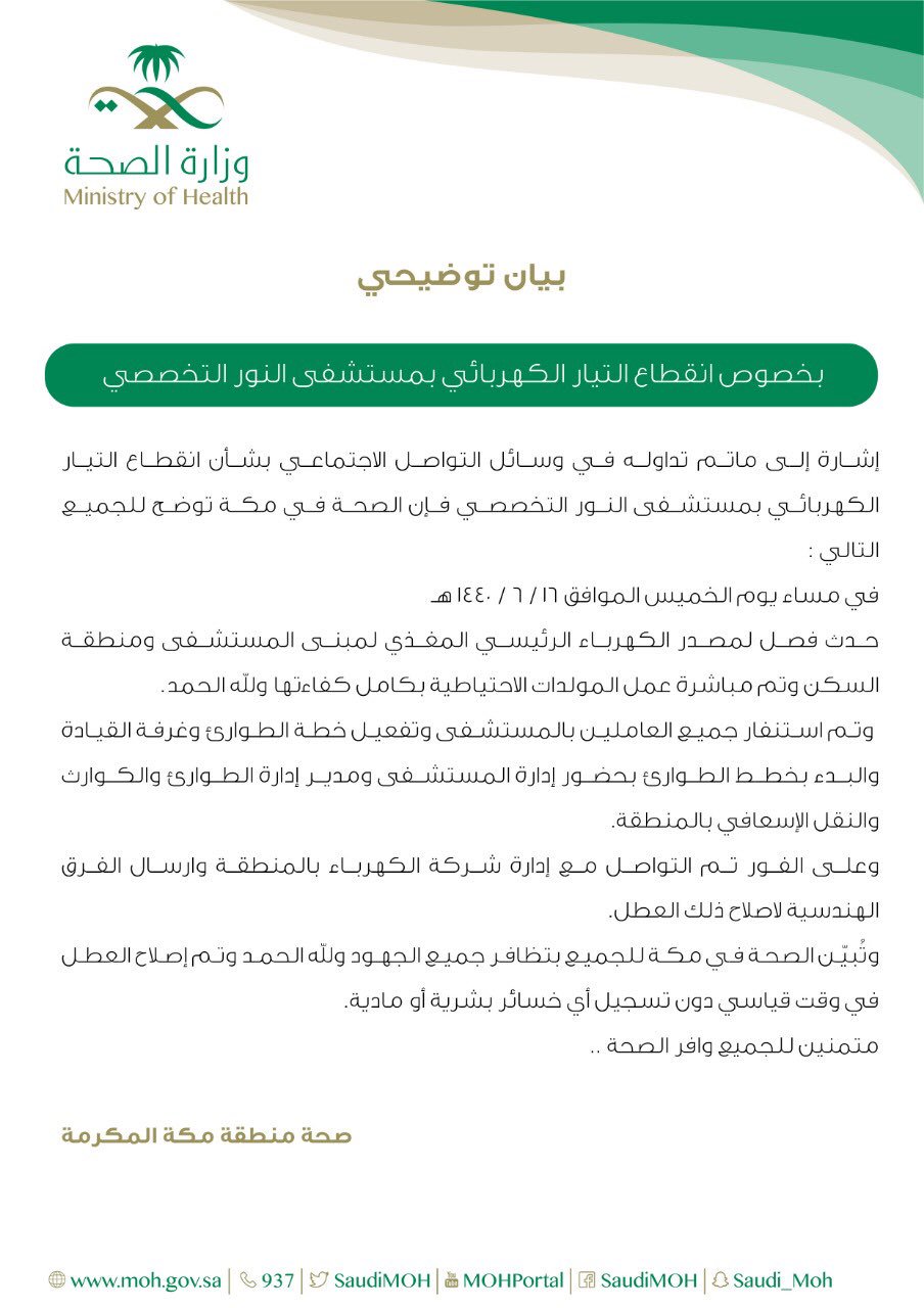 صحة مكة المكرمة على تويتر بيان توضيحي بخصوص انقطاع التيار الكهربائي عن مستشفى النور التخصصي بمكة المكرمة دون حدوث أي أضرار بشرية أو مادية ولله الحمد متمنين للجميع وافر الصحة صحة مكة Https T Co Gqv2csrvcb