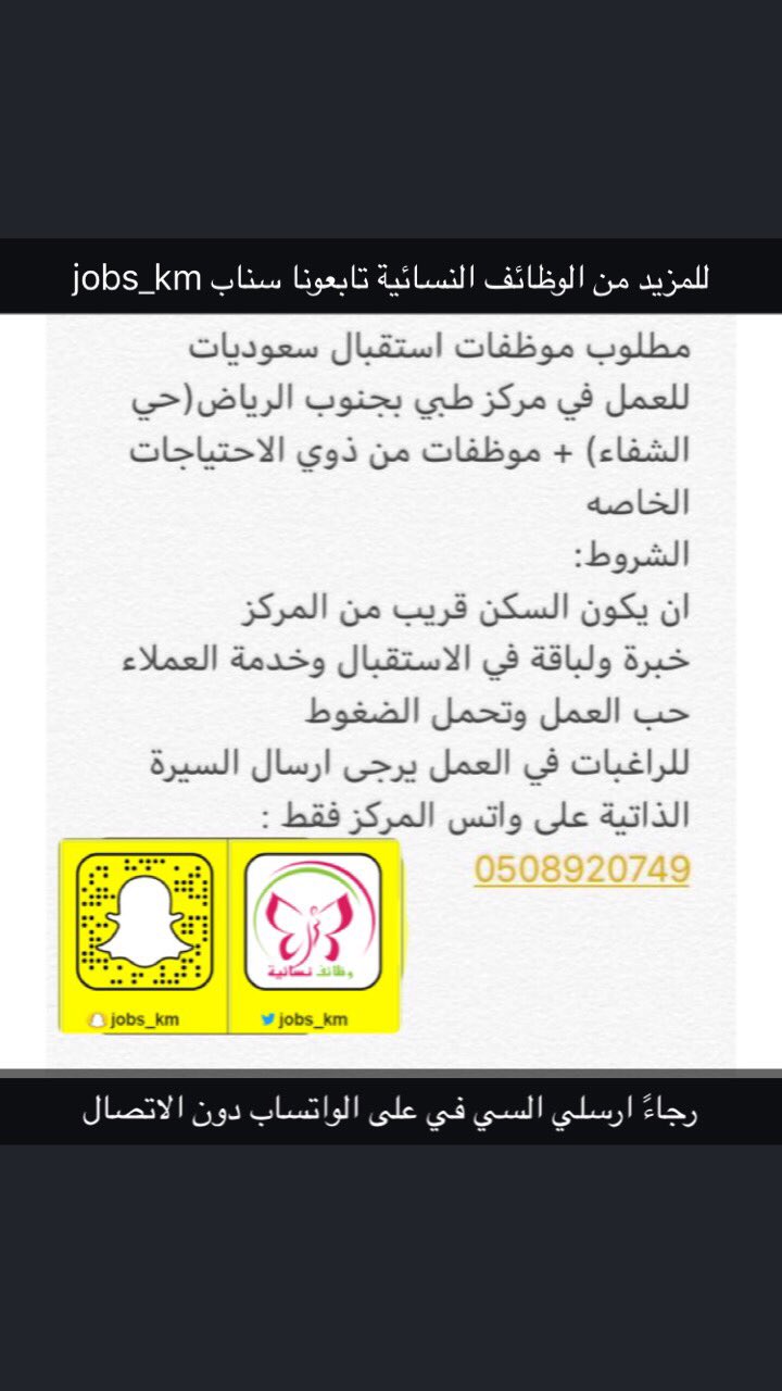وظائف نسائية No Twitter وظائف نسائية في الرياض مطلوب موظفات استقبال سعوديات للعمل بمركز طبي بجنىب الرياض حي الشفاء موظفات من ذوي الاحتياجات الخاصة شرط ان يكون سكنها قريب من المركز
