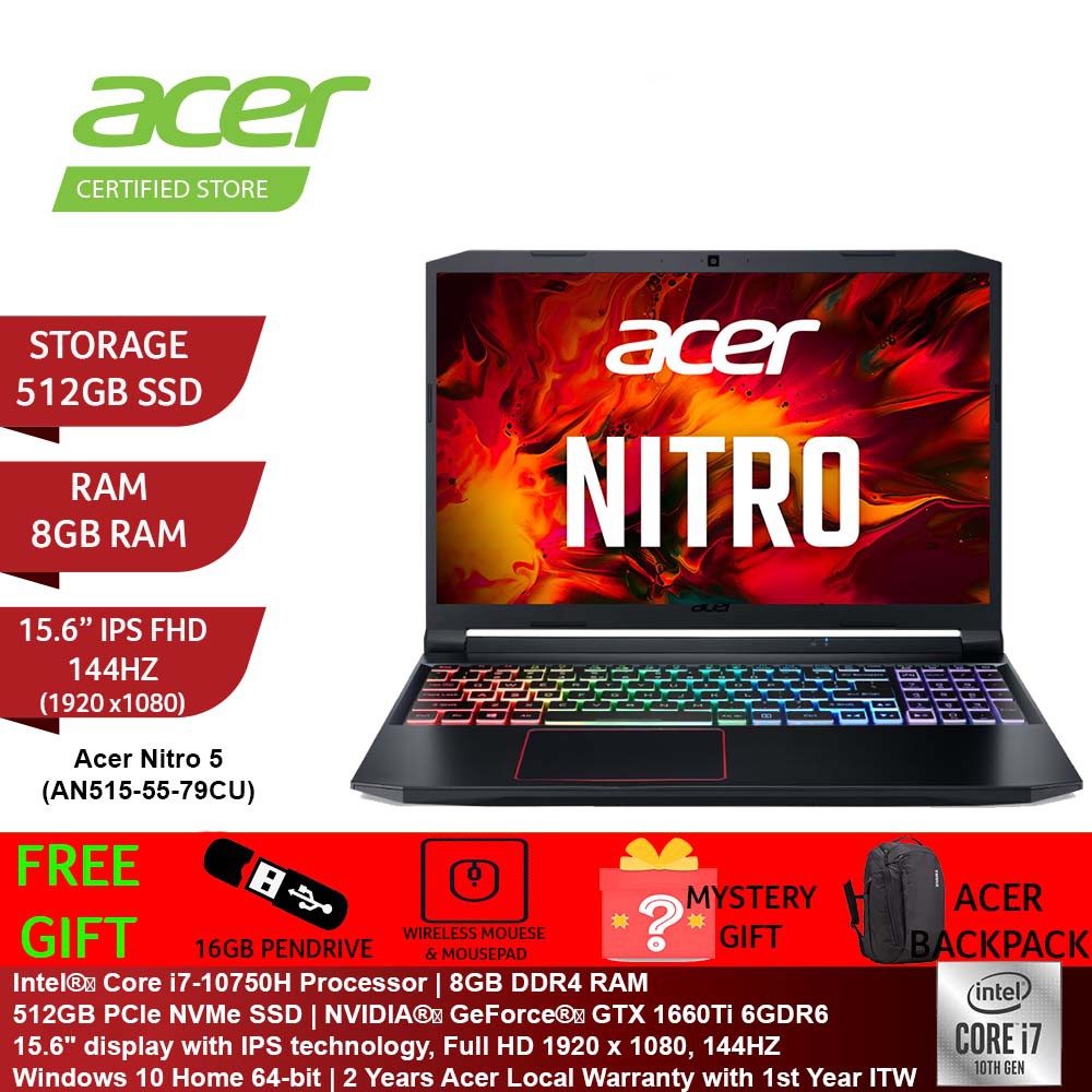 Acer Nitro 5 An515 55 79cu Intel I7 10750h 2 60 5 0ghz 8gb D4 512gb Ssd 15 6 Fhd 144hz Nvd Gtx1660ti 6gb D6 Windows 10 Tmt The Largest I T Retailer In Malaysia