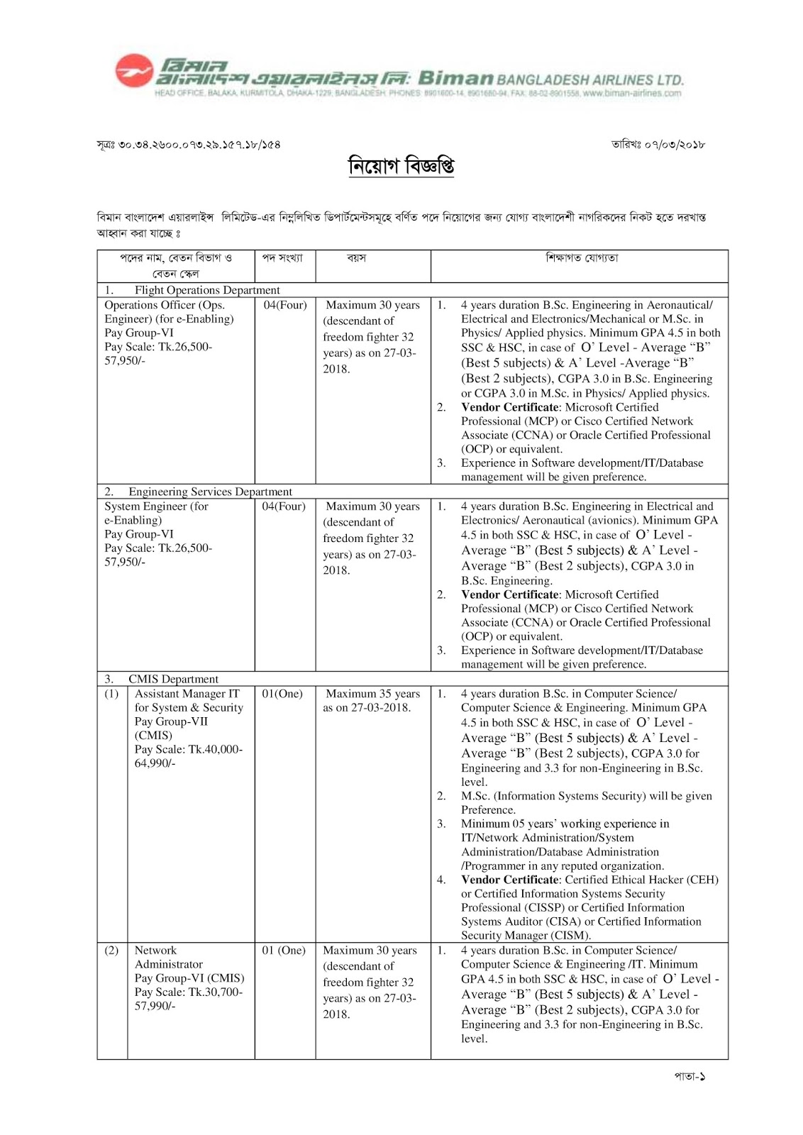 Latest Job Information Bangladesh Biman Bangladesh Airlines Job Circular 2018