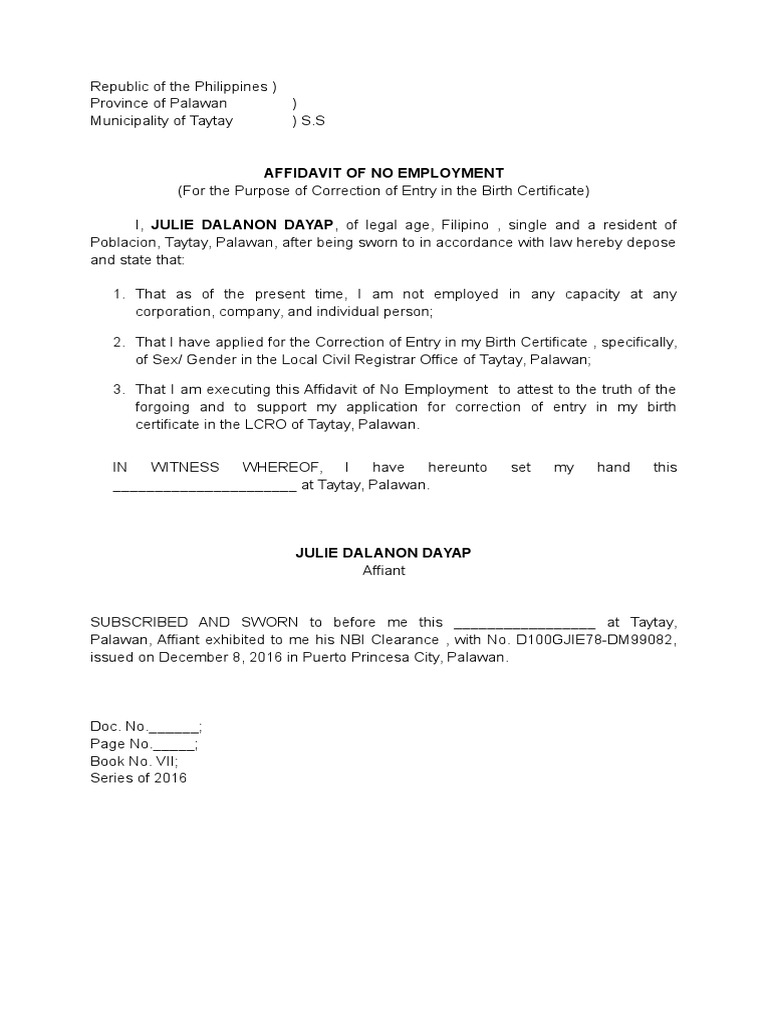 Edwin Affidavit Of Non Employment For Correction Of Birth Certificate Doc