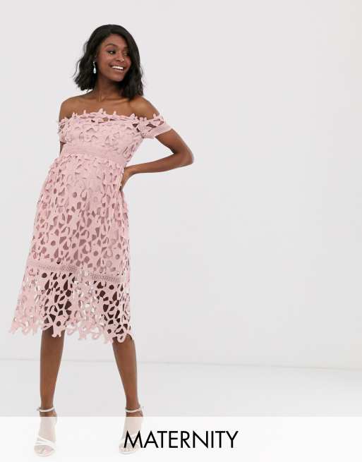 Chi Chi London Maternity Bardot Lace Midi Dress In Pink Asos