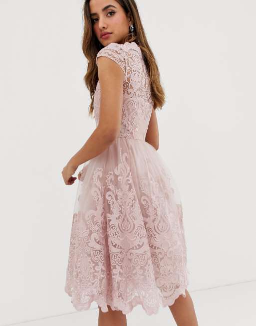 Chi Chi London Premium Lace Midi Prom Dress With Bardot Neck Vintage Rose Gold Asos Online