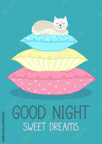 Good Night Sweet Dreams White Cat Sleeping On Stack Of Pillows Cute Vector Illustration Buy This Stock Vector And Explore Similar Vectors At Adobe Stock Adobe Stock